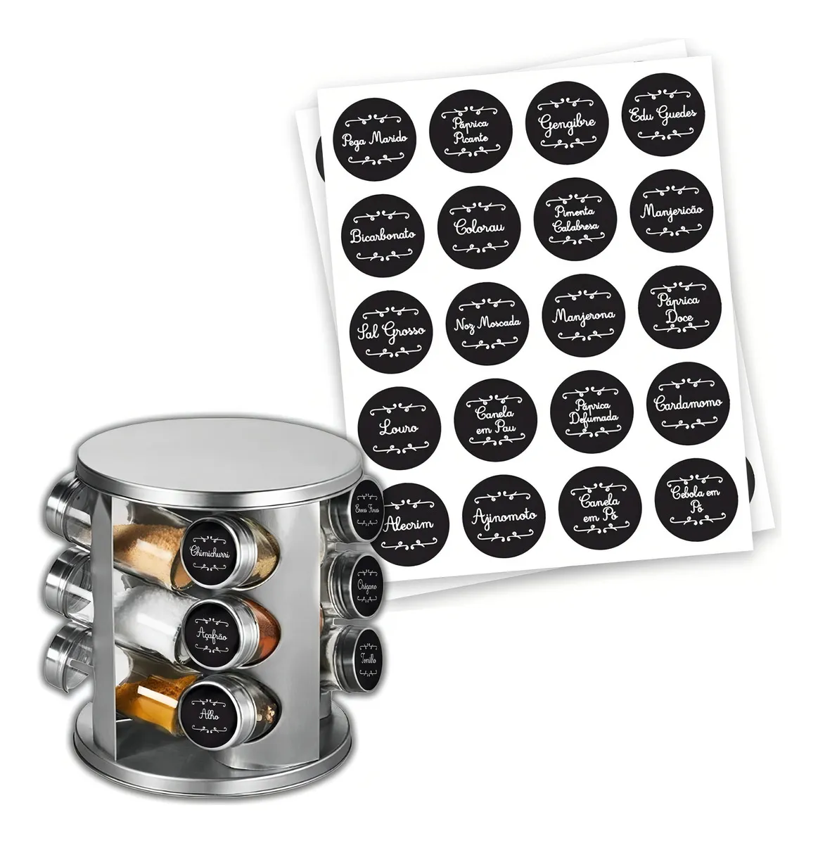Conjunto de 92 etiquetas adesivas para potes, temperos e grãos, com design na cor preta, proporcionando organização e estética à sua dispensa. Inclui 12 etiquetas maiores e 80 menores, todas impressas em vinil adesivo impermeável de alta qualidade e recortadas em formato redondo. Tamanhos das Etiquetas: Menores: 38x38mm Maiores: 78x78mm Distribuídas em cartelas para facilitar o manuseio.