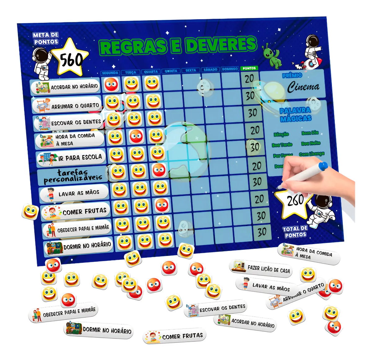Defina as tarefas a serem cumpridas.(exemplo: Guardar os brinquedos) Defina a pontuação pra cada tarefa (guardar os brinquedos = 10 pontos. Marque os dias da semana que a tarefa foi cumprida e some os pontos ex cumpriu 4 dias semana = 40 pontos.
